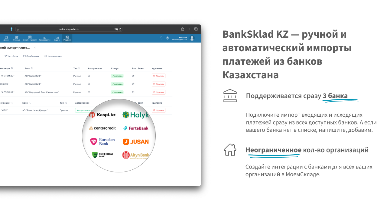 Автоматический и ручной импорты платежей из банков Казахстана: Kaspi, Halyk, ЦентрКредит, Forte, Altyn, Jusan и др.