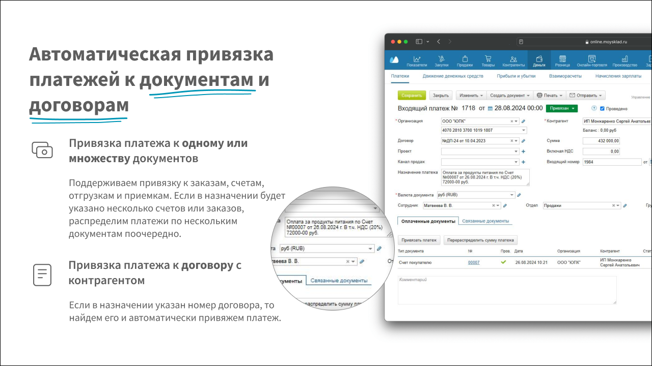 - Платежи привязываются к заказам, счетам, отгрузкам и приемкам, ищется совпадение по названию