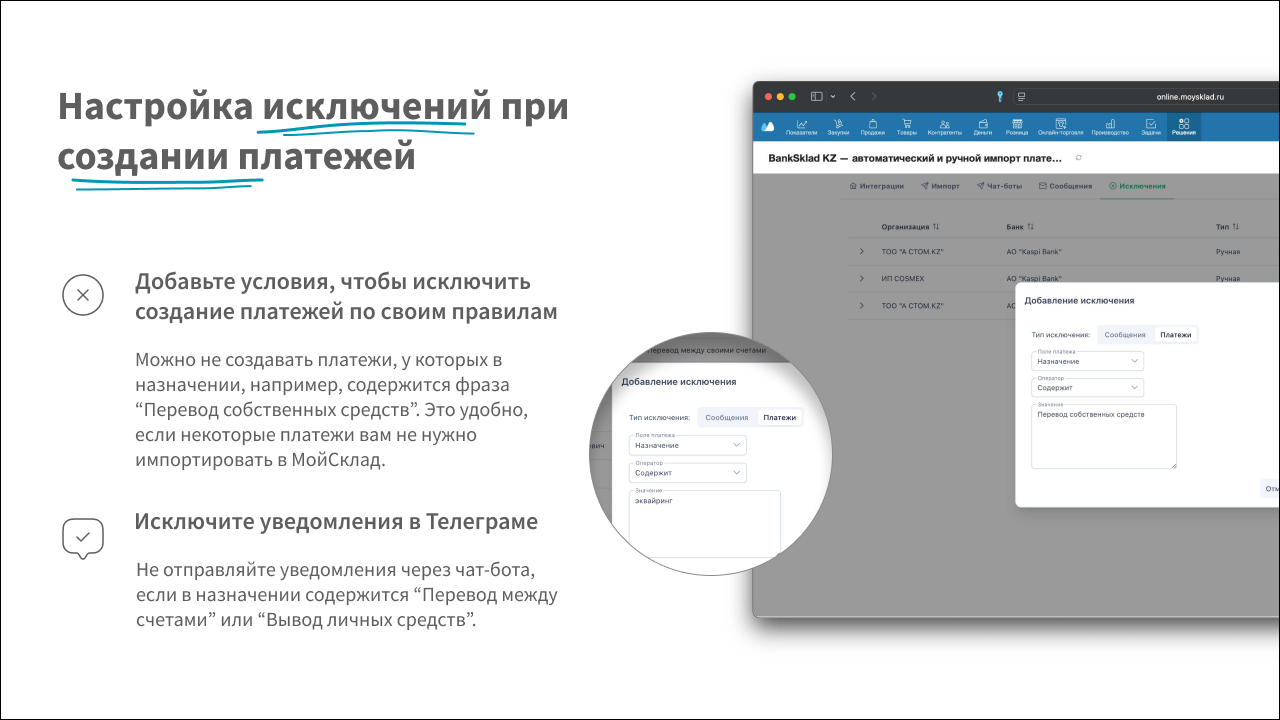 - Можно добавить исключения для уведомлений, указав текст, при наличии которого в платеже уведомления приходить не будут
