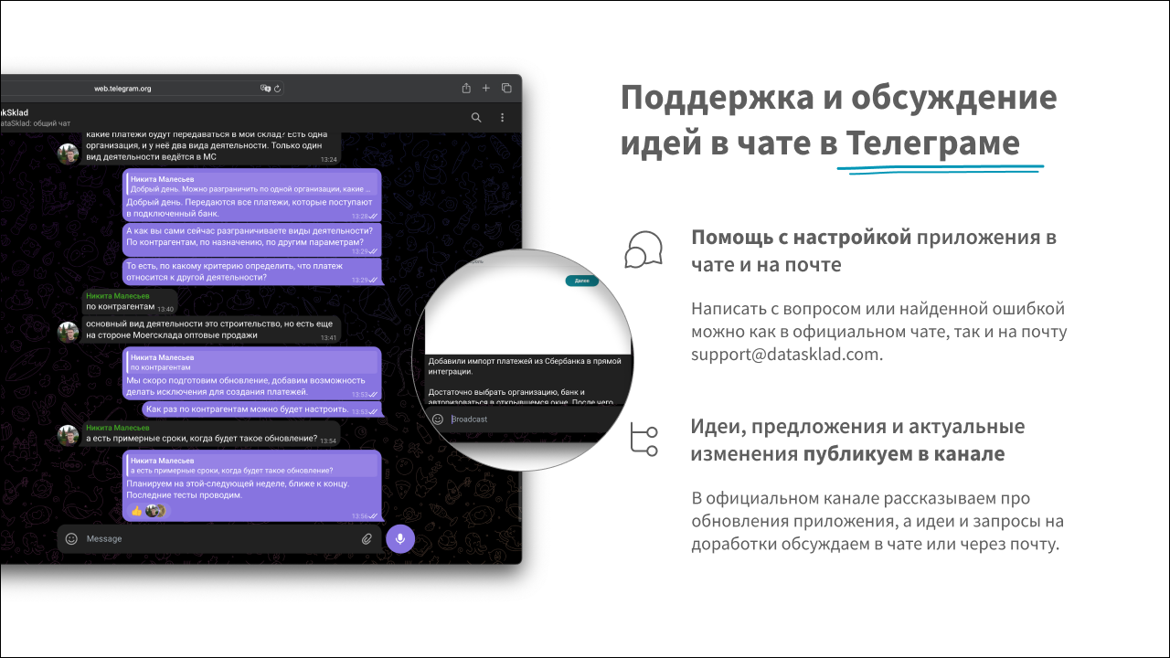 - Можно настроить уведомления в Телеграме по различным чатам для входящих и исходящих платежей