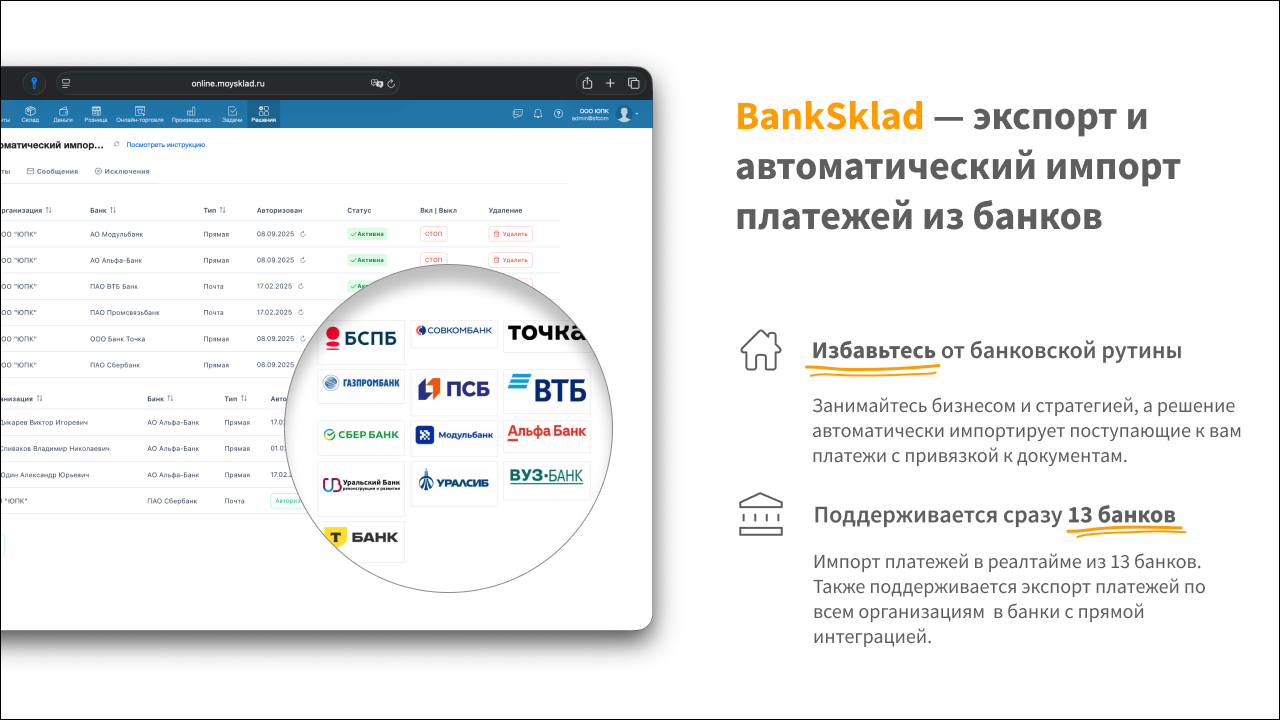 BankSklad — экспорт платежей и автоматический импорт выписки из банков