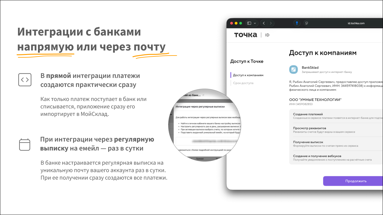 - Поддерживается интеграция с банком как прямая, так и через регулярную выписку по расписанию на уникальную почту