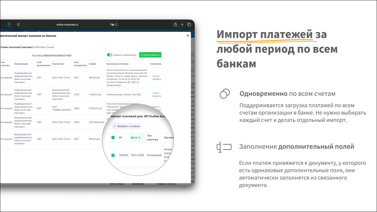 - Импортирует входящие и исходящие платежи из подключенных банков, как автоматически, так и вручную за любой период