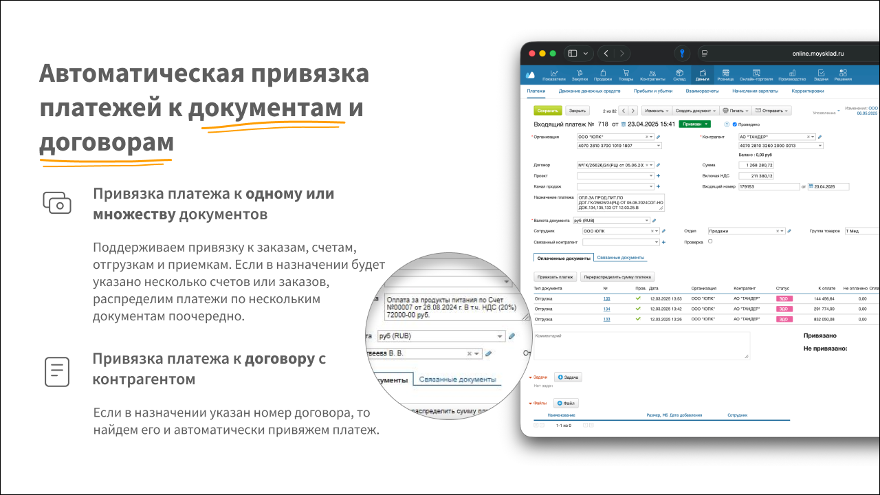 - Платежи привязываются к заказам, счетам, отгрузкам и приемкам, ищется совпадение по названию