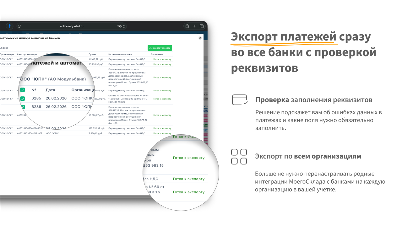 - Платежи создаются сразу после поступления или списания на всех расчетных счетах всех организаций в МоемСкладе