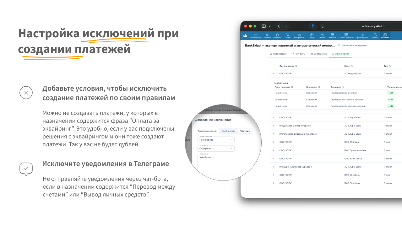 - Можно добавить исключения для уведомлений, указав текст, при наличии которого в платеже уведомления приходить не будут