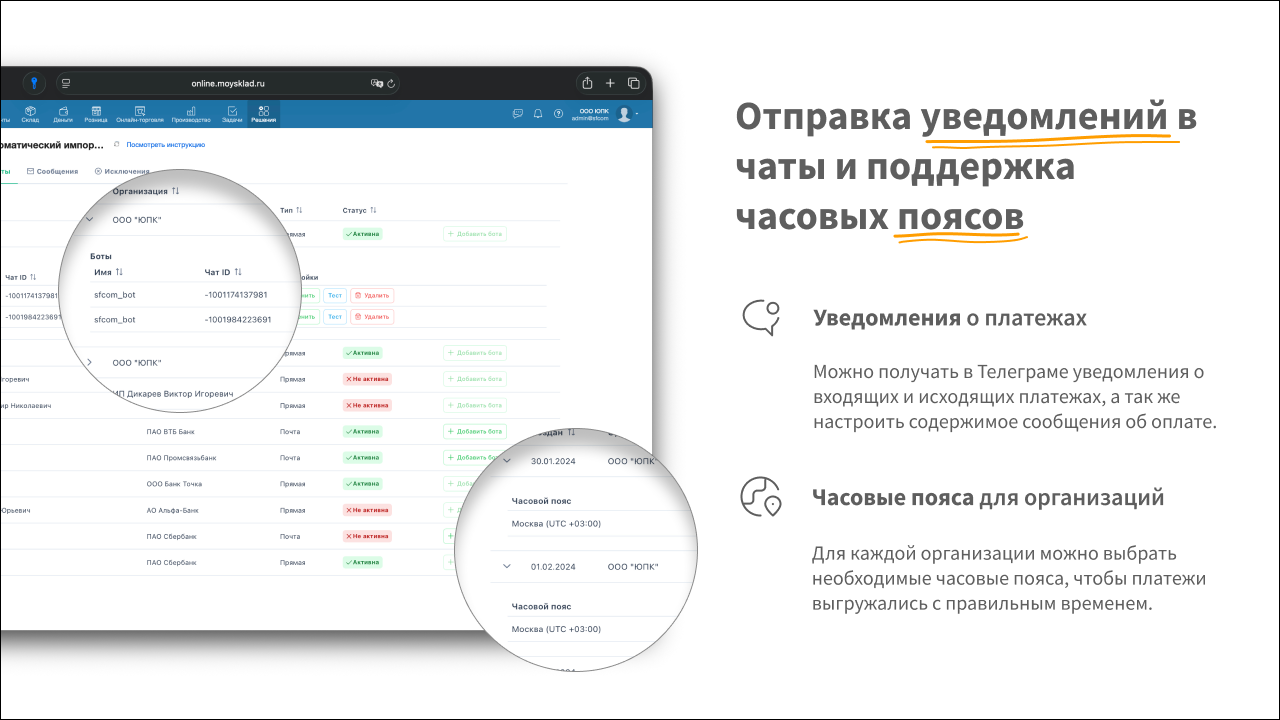 - Можно настроить уведомления в Телеграме по различным чатам для входящих и исходящих платежей