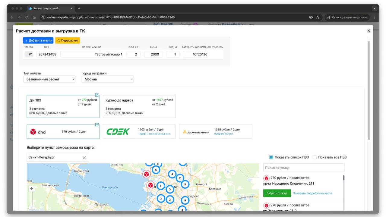Расчет доставки в МойСклад работает по всем подключенным к eShopLogistic службам доставки. Выгрузка заявок на доставку в кабинеты ТК на сегодняшний день реализована для СДЭК, DPD, Яндекс Доставка, Деловые Линии и 5Post, остальные ТК добавим постепенно, по мере развития приложения и запросов пользователей.