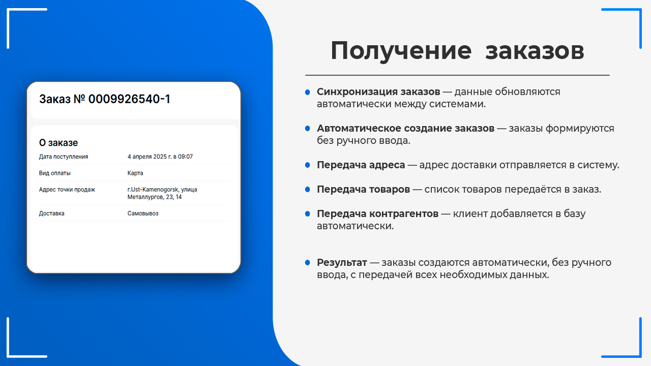 ✓ Получение данных о клиенте из Заказа и автоматическое создание контрагентов