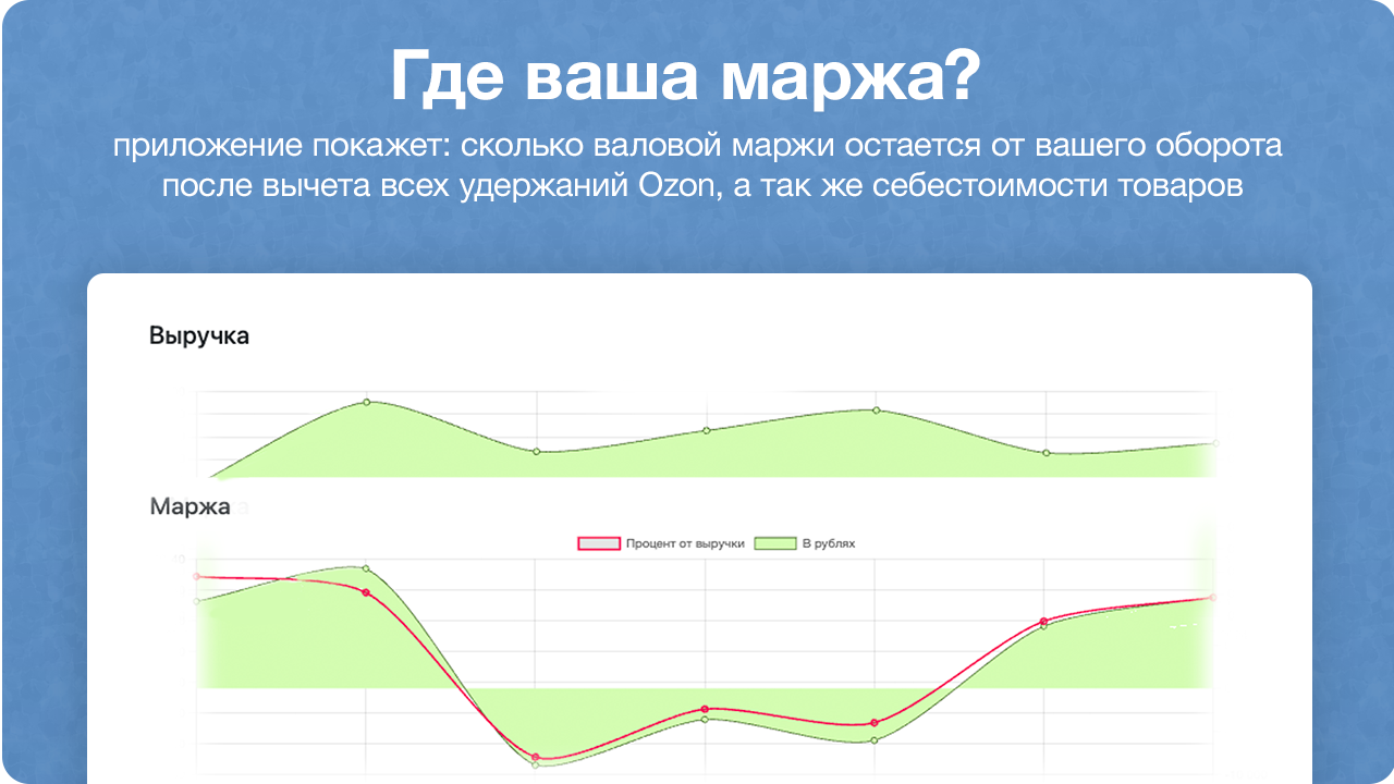 С приложением вы лучше поймете свою реальную маржу и сможете ей управлять. Мы понимаем, насколько сложно считать и управлять кабинетом Озон. Особенно, если их несколько. В связке с МойСклад мы это исправим.