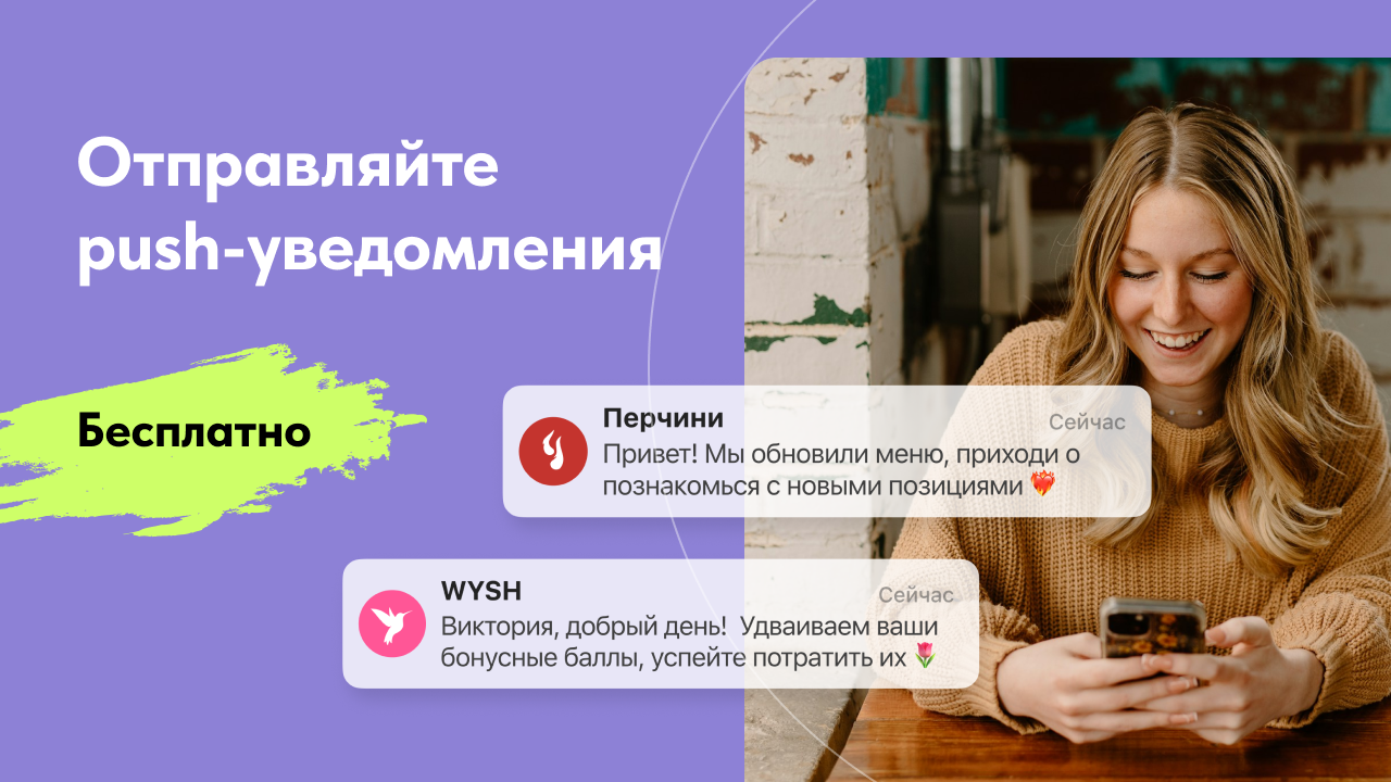 Массовые бесплатные push уведомления. Расскажите о ваших акциях и новостях.