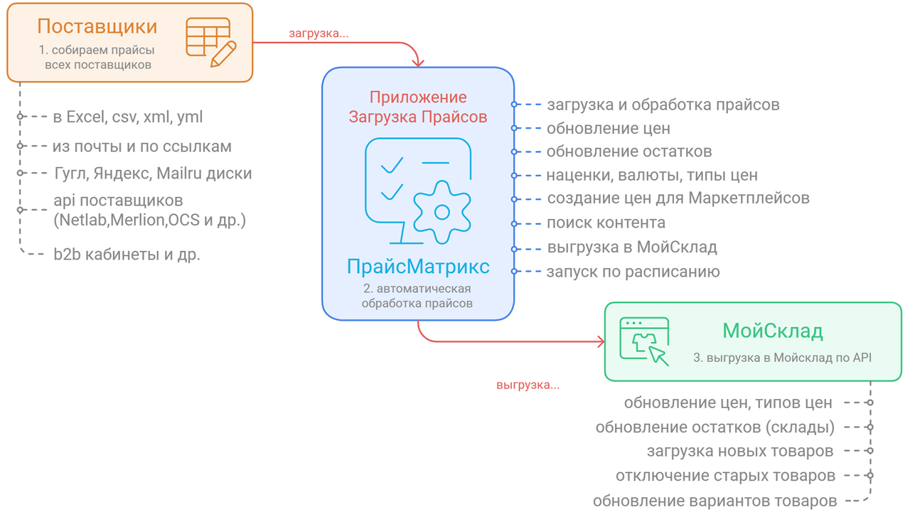Приложение позволяет собрать все прайсы в одном месте и обновлять автоматически цены и остатки товарам в МойСклад.