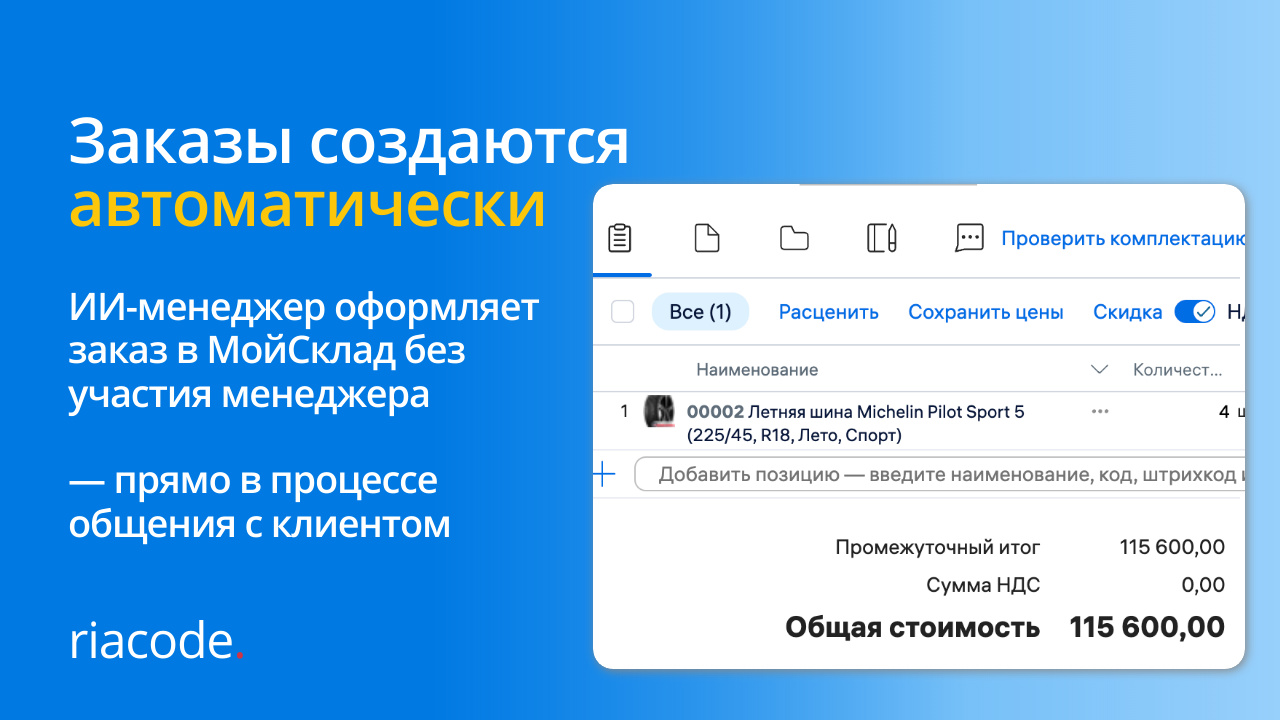 ИИ-бот автоматически отвечает клиентам, ищет товары в МойСклад, сообщает актуальные цены, остатки и помогает оформить заказ прямо в диалоге — без участия менеджера.