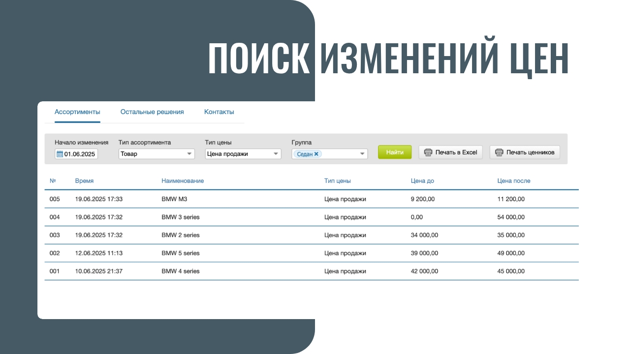 Приложение помогает быстро найти все товары, услуги и комплекты с изменёнными ценами по фильтрам. Данные можно выгрузить в Excel отчет или сразу перейти к массовой печати ценников.