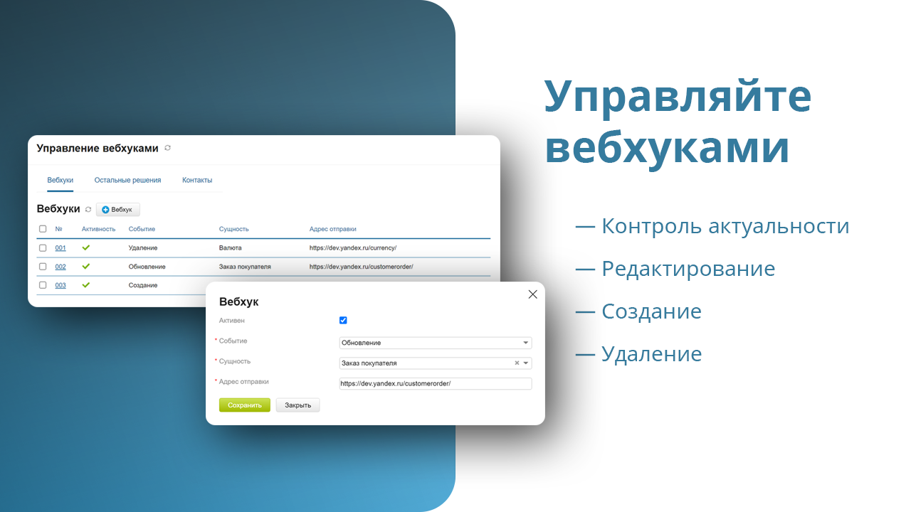 *- Вебхук (webhook) позволяет моментально получать события по сущностям МойСклад. Эти события используют внешние сервисы для выполнения своих задач.