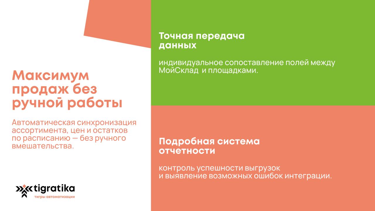- Полная автоматизация — регулярная выгрузка ассортимента, остатков и цен без ручного вмешательства.