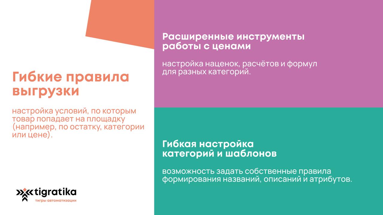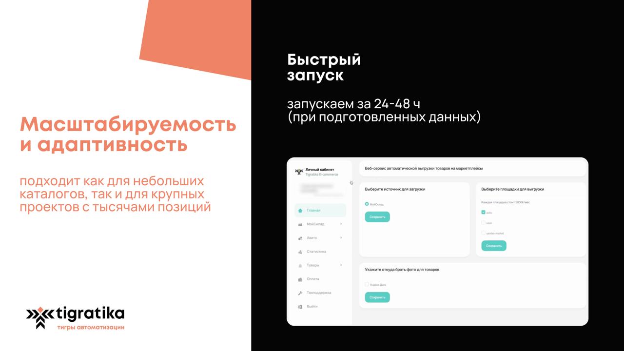 - Решение предлагает полный и гибкий комплекс функционала, который можно точно настроить под особенности ассортимента и требований площадки. Возможности настройки сопоставимы с кастомной разработкой, при этом не требуют дополнительных интеграций или программирования. Всё необходимое доступно в рамках одной цены — без скрытых тарифов и ограничений по категориям. При необходимости возможна реализация индивидуальных доработок под конкретные задачи.