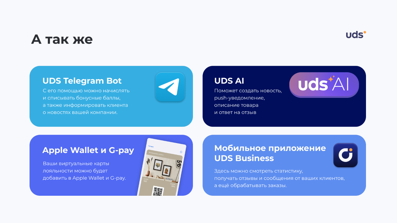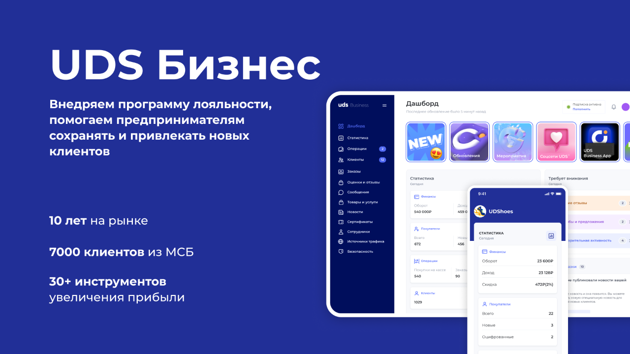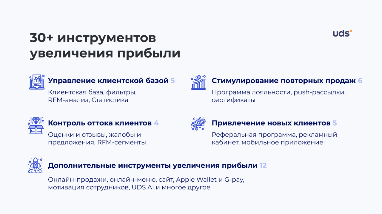 UDS — умножаем прибыль, делаем покупателей счастливыми и повышаем количество их визитов. Бизнес-решение UDS способствует поддержанию и развитию клиентской базы, позволяет создать уникальную программу лояльности, идеально подходящую для вашего бизнеса и в полной мере оценить эффект рекомендательного маркетинга.